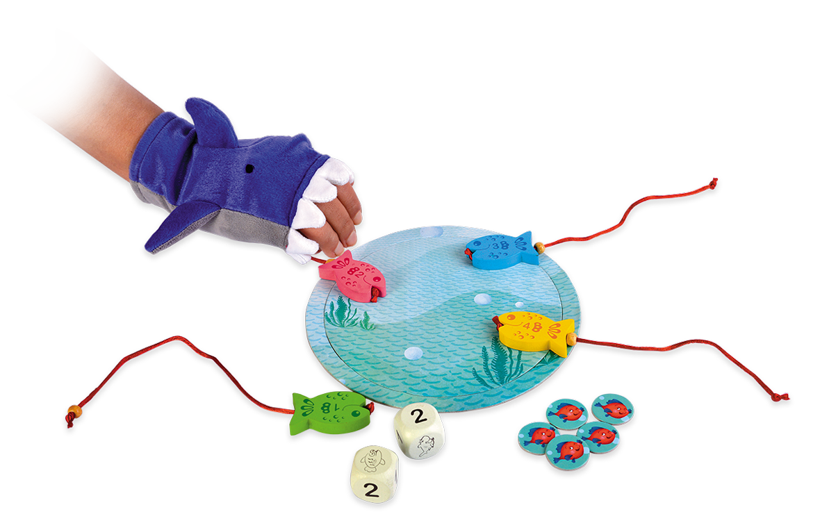 Regulament: Jocul 1-Atacul rechinului: La inceputul jocului, fiecare jucator primeste 8 jetoane cu pestisori. Alegeti cine va fi rechinul, iar acest jucator va purta manusa cu rechin. Ceilalti jucatori vor fi pestisorii si vor primi cate o piesa de joc cu pestisor si sfoara. Rechinul alege un numar de "atac" cuprins intre 1 si 4 si il va spune si celorlalti jucatori, apoi da cu zarul. Daca numarul de atac pica la zar toti jucatorii incearca sa isi traga pestisorii din calea rechinului.Daca un pestisor este prins, acesta trebui sa ii dea rechinului unul dintre jetoanele sale. Daca numarul de atac nu pica la zar pestisorii nu trebuie trasi din apa. Daca jucatorii isi scot brusc pestisorii din mare, atunci acesti jucatori trebuie sa ii dea Rechinului cate un jeton. Jocul se termina cand unul dintre jucatori a ramas fara jetoane, iar jucatorul cu cele mai multe jetoane castiga jocul. Jocul 2- Fereste-te de Rechin: Rechinul arunca cu zarul. El trebuie sa incerce sa prinda pestisorul cu acelasi numar ca cel nimerit la aruncarea zarului. Daca rechinul reuseste sa prinda pestisorul, atunci pestisorul trebuie sa dea rechinului un jeton. Daca rechinul nu prinde pestisorul, atunci trebuie sa ii dea respectivului jucator un jeton. Daca un jucator cu pestisor al carui numar nu a picat la zar isi retrage pestisorul din mare, atunci el trebuie sa ii dea rechinului un jeton. Jocul are mai multe variante de joc haioase, descopera-le citind instructiunile!