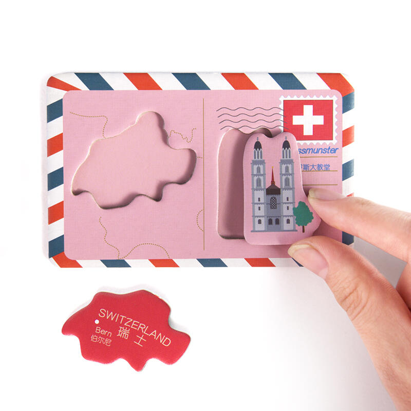 - potriveste cu atentie piesele in forma de tari pe cartea postala corespunzatoare, fiecare carte postala fiind un adevarat puzzle incastru